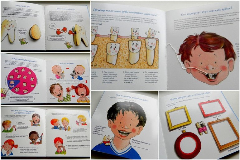В книге есть подвижные детали, чтобы наглядно посмотреть как растут зубки от 1 года до трех лет. Множество разных окошечек и даже безопасное зеркальце!!!. Но у моей детворы особой популярность пользуется страничка, где мальчику можно вырвать молочный зубик:))