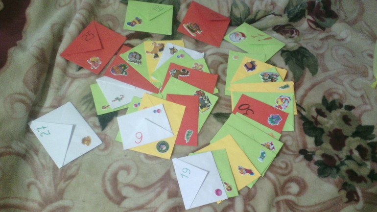В прошлом году я делала с мамой 31 носочек, на них числа прикрепляла и Маша каждый день находила подарочек в носочке. В этом году захотелось ей что-то посложнее,пусть попыхтит)))