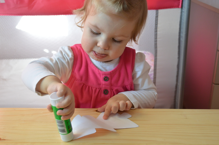 Сначала я нашла шаблон елочки, наклеила на него с одной стороны двухсторонний скотч и вырезала по контуру. Это была подготовка с моей стороны. Потом творили уже вместе) Катюша намазала клеем-карандашом нашу елочку с другой стороны и приклеила на основу - цветной картон.