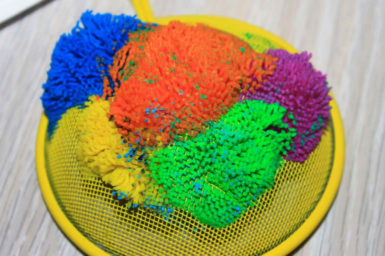Такие вот ежи у нас получились из пластилина. Иголочки сделали с помощью металлических ситечек.Тем же способом сделали разноцветных мох.