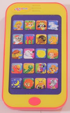 Плеер, внешне напоминает смартфон, размер этого чуда 13х7 см, внизу располагается кнопка вкл/выкл. На «экране» картинки с кнопочками, на которые нажимаешь и играет песенка (первый куплет и припев). Громкость не регулируется, но на мой слух она оптимальна. Всего устройство воспроизводит 20 песенных фрагментов: