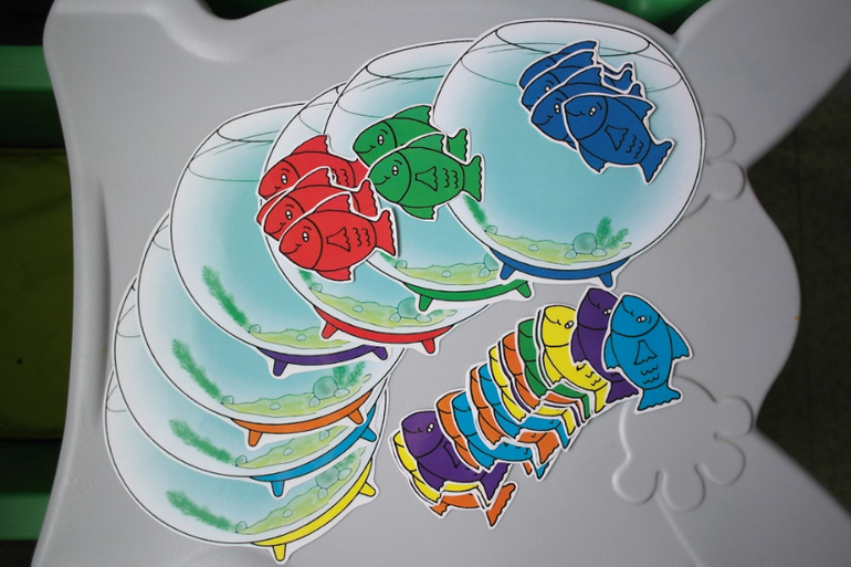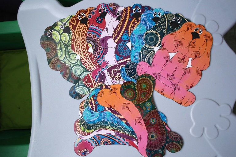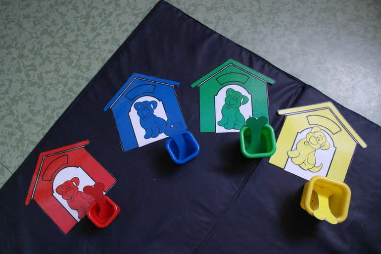 Лото-то мы любим в любом его проявлении - поиск пары, тень, контур, ассоциации, узор, а вот сортировать по цвету долго категорически отказывалась. И ведь знает цвета, но когда прошу положить желтый шарик в желтый стаканчик - нет!. Кладет по очереди во все другие стаканчики, но не в желтый. На скорую руку вот такую игрушку сделала на сортировку на 4 цвета. Тематика - конечно же собаки, т.к. у нас дома собака, и все игры с собаками идут на ура. И о чудо! Сработало!