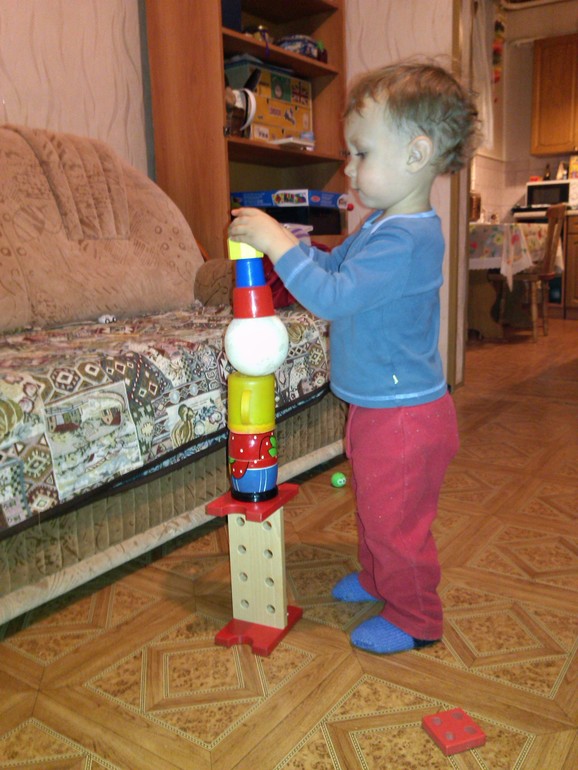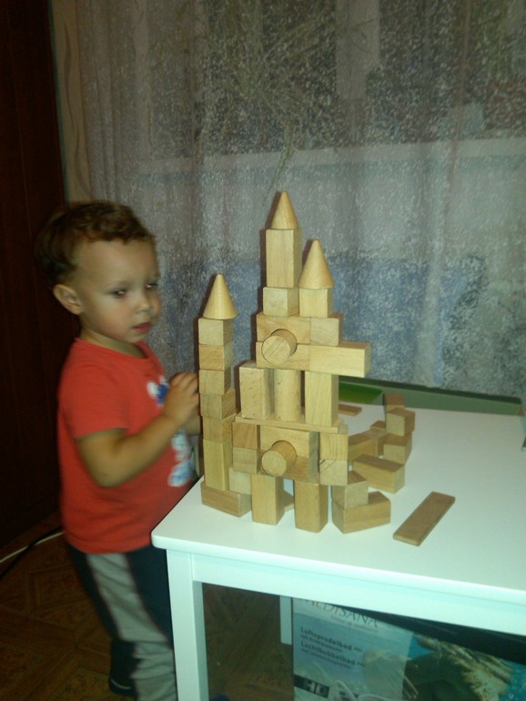 Где-то я прочитала, что ребёнку полезно начать заниматься с конструкторами, состоящими именно из кубиков, брусочков, чтобы он знакомился с балансом, равновесием, а уже потом давать ему Лего. Лего нам подарили на ДР, большой, интересный набор, но пока он скучает в коробке, дожидается своего часа, снеговик-то из него никакой...