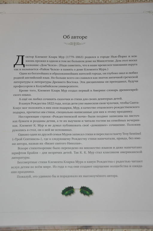 А теперь расскажем о двух вариантах издания классической истории "Рождественская ночь" от Клемента Кларка Мура. Вот небольшой рассказ об авторе и истории возникновения этой, уже ставшей классикой мировой литературы, истории из первого издания (от Махаона).