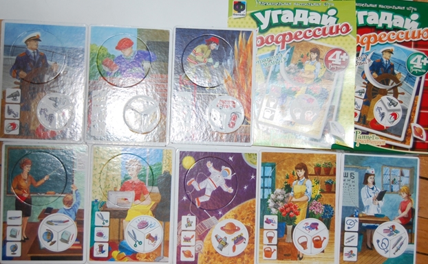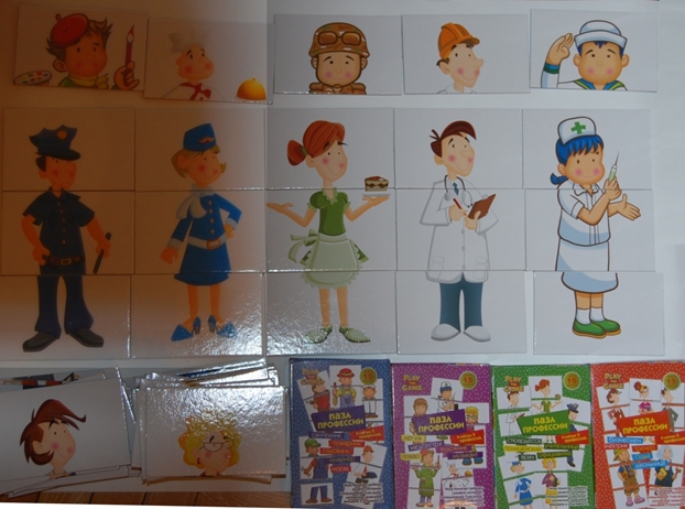 Ребенок любит вкладыши, поэтому часто играет в угадай профессию. Угадай профессию "Кем работают мамы?" и угадай профессию "Кем работают папы?" Единственное в каждой коробке всего 4 профессии, поэтому нужно дополнять материал.
