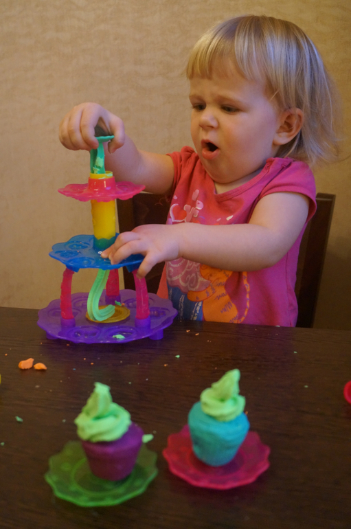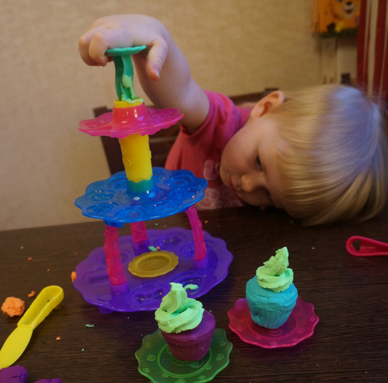 Мистер Умелец или Очумелые ручки (поделки, аппликации, интересные находки, идеи и задумки)Как только мы устроили с Машей замес на кухне, изготавливая витражное печенье, так, тут же наш папа купил нам мини набор Play Doh для приготовления капкейков. Красивая корзиночка, формочки, шприц, 2 тюбика пластилина с пометкой "плюс", то есть имеющего более мягкую текстуру, которая позволяет более красиво и легко выдавливать крем. Минус на мой взгляд в неудобности доставать мелкие украшения из формочек, родителю трудно, а ребенку и подавно. Но в целом, красиво, вкусно, увлекательно!