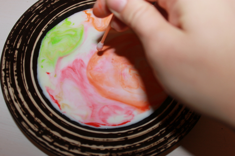 Еще есть один увлекательный опыт. В тарелочку наливаем молока, капаем несколько капелек красителя . Берем ватную палочку, смоченную в жидкости для мытья посуды и втыкаем ее прямо в центр миски. С краской происходят удивительные чудеса. Молоко помимо воды содержит частицы жира , протеины, которые весьма чувствительны к изменениям раствора. Жидкость для мытья посуды ослабляет химические связи и происходит бурная реакция и мы это видим когда красители начинают смешиваться между собой.
