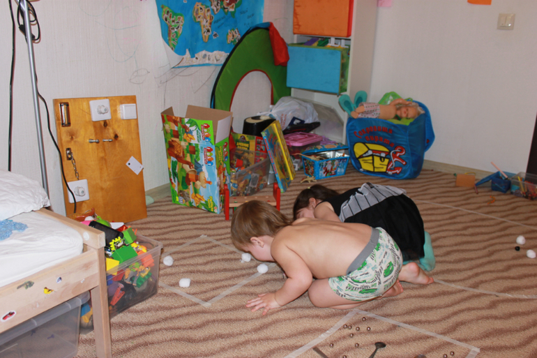 Легкие пампончики нужно было "удуть" из большого круга в маленький квадрат, железные шарики и ложки с помощью магнитной удочки в другой квадрат, а насекомых на ложке нужно унести в 3й квадрат.