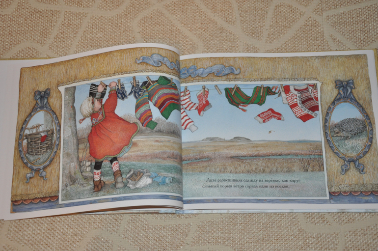 В-третьих, это книжка-игра. На каждом развороте, помимо основной иллюстрации есть еще два боковых окошка - одно из них показывает, что в данный момент делает девочка Лиза, а другое - кого мы встретим на следующей странице. А сверху показана веревка с вещами и что с ней происходит во времени))
