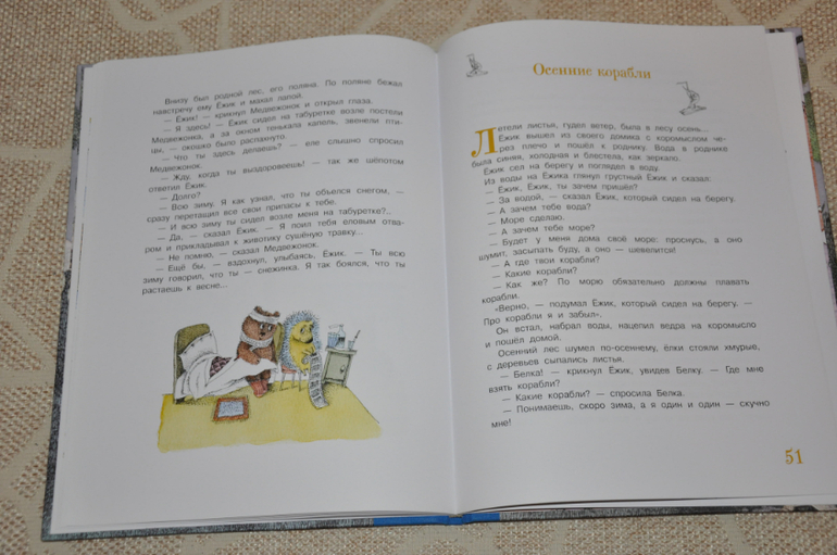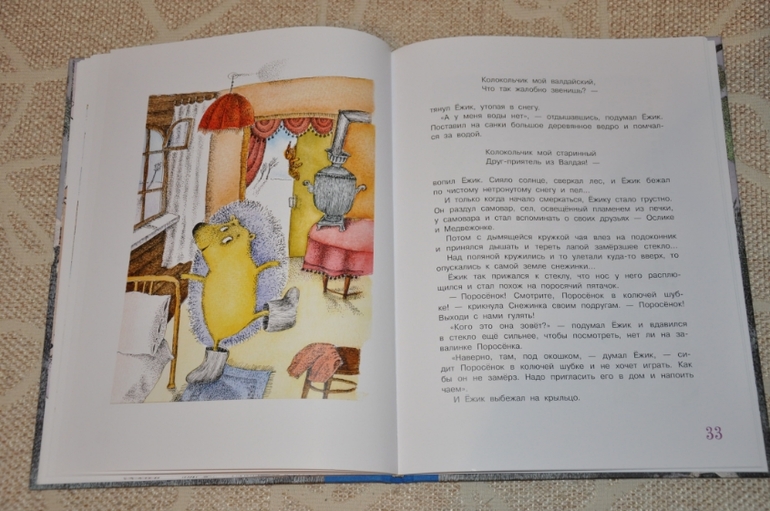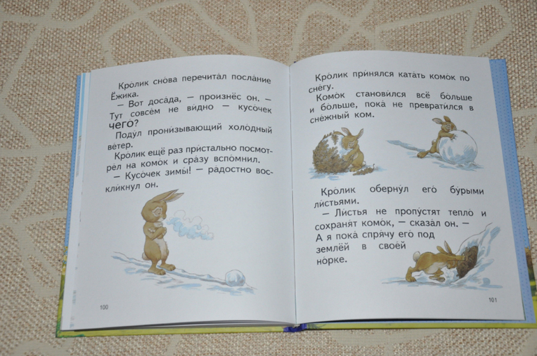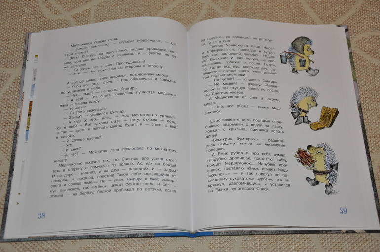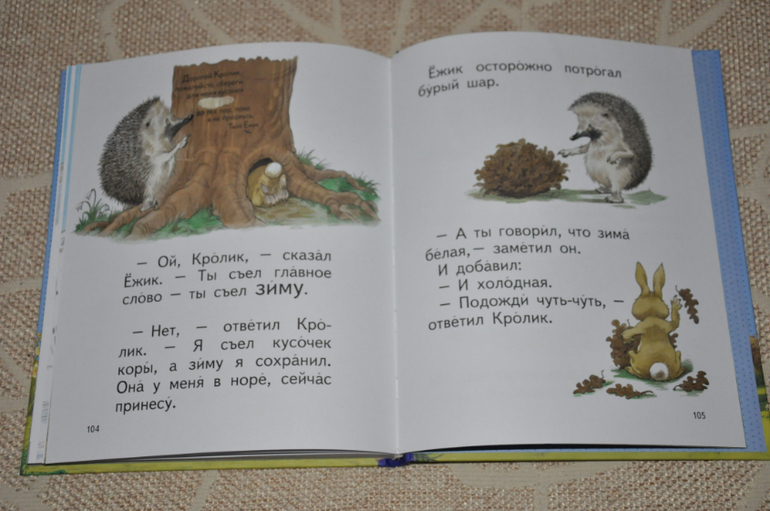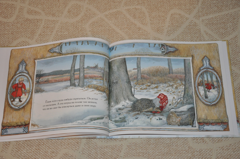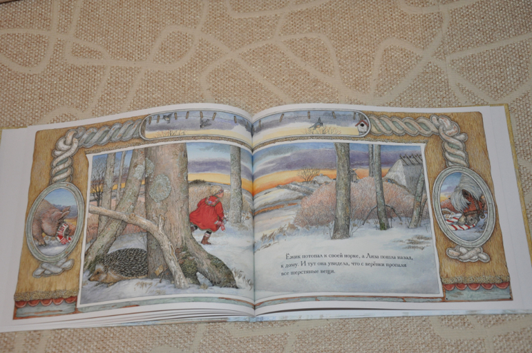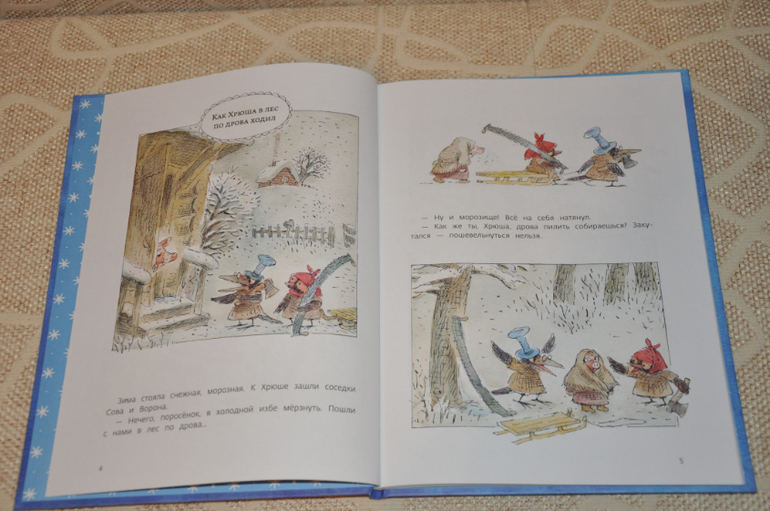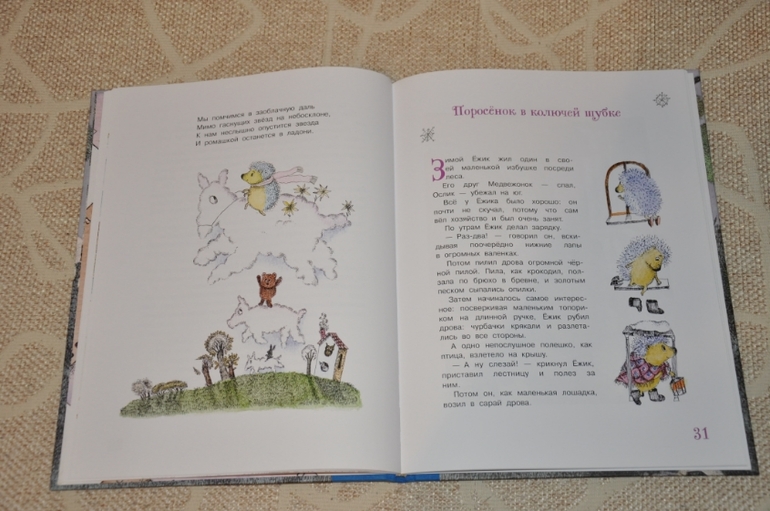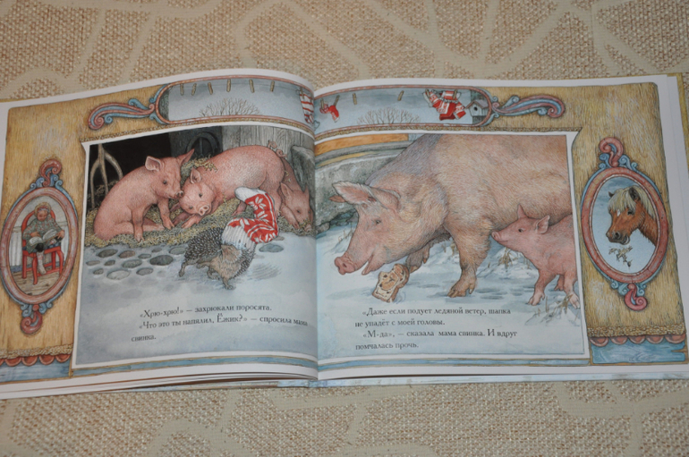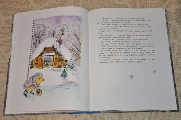 Целиком мы пока осиливаем только короткий рассказ "Поросёнок в колючей шубке". Он, кстати, тоже зимний)) Вот развороты: