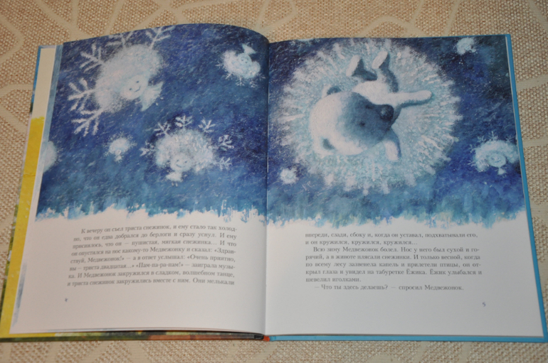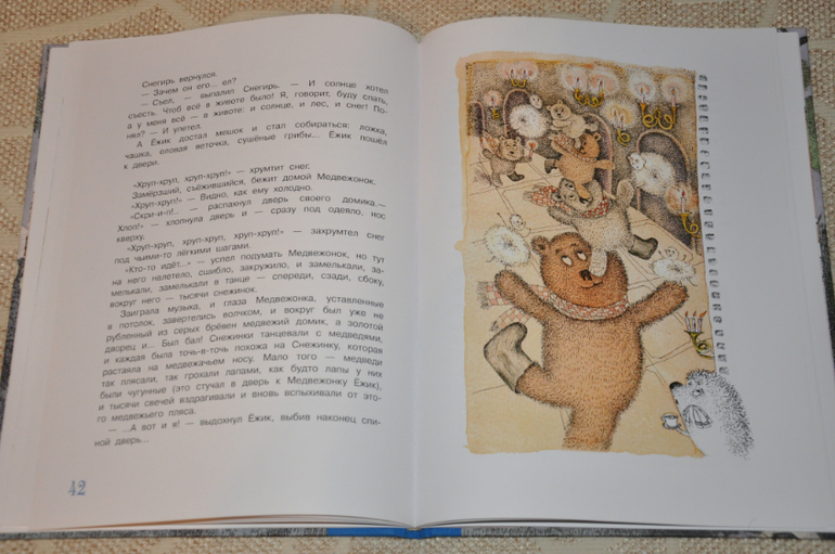И покажем, конечно, "Зимнюю сказку", которая в иллюстрациях Евгения Антоненкова кажется еще более милой и трогательной. Она про то, как Медвежонок, объевшись снежинок, заболел и заснул на всю зиму, а заботливый Ёжик все это время просидел рядом с ним на табуретке, поил его лиловым отваром и очень боялся, что он растает, так как Медвежонок во сне говорил, что он Снежинка!