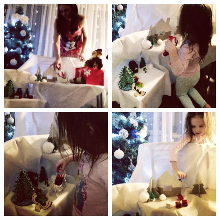 Почти всё необходимое для спектакля нашлось у нас дома. Маленького Деда Мороза я шила сама. Елочки и домик деда Мороза мы делали вместе с Софией, сани больших дедов Морозов - коробка из Икеи с картонными полозьями.