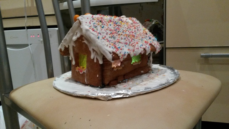 В домик поставили фонарик, чтобы витражи из леденцов светились.