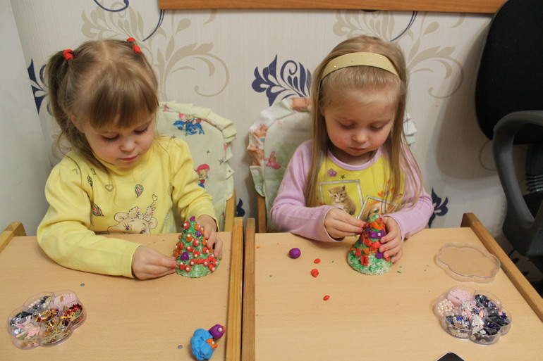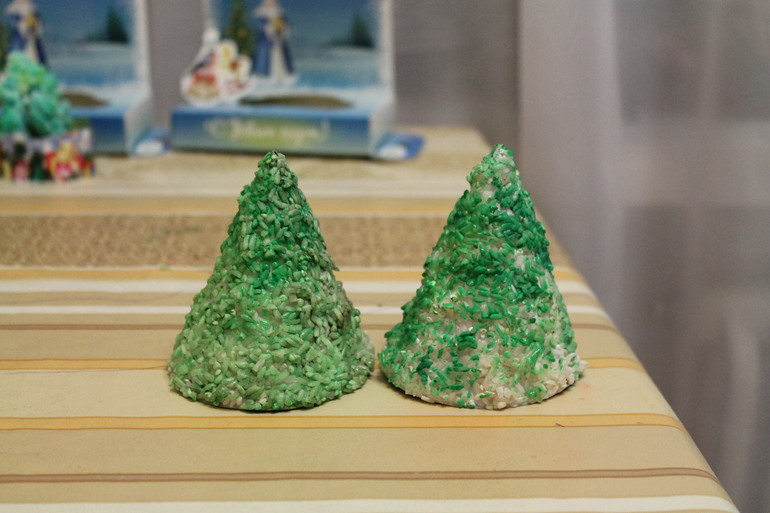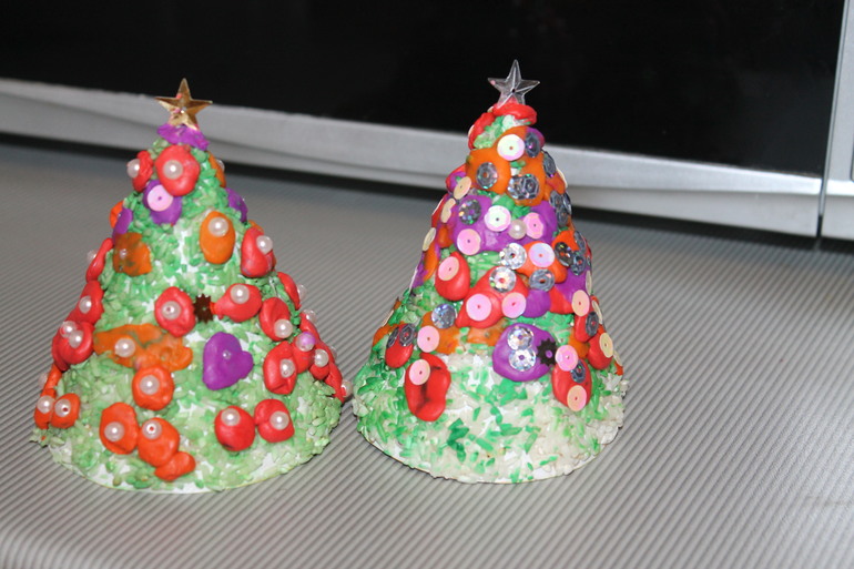 Первая елочка и картона и риса на пва клеили, потом сохла , разукрасили , опять сохла, а потом уже на пластилин ляпали украшения
