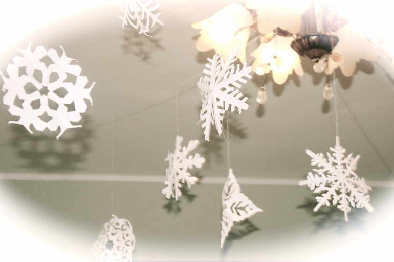 День 5: Вырезаем снежинки и украшаем ими зал! Для этого я отдельно скачала большие трафареты. Опять же, это задание растянулось не на один день. В воскресение пора было собираться на предстоящую неделю. Вырезали несколько больших снежинок на бумаге для принтера. Оказалось это не так легко) Еще к снежинкам будем возвращаться а неделе. Надо будет потоньше бумагу поискать)