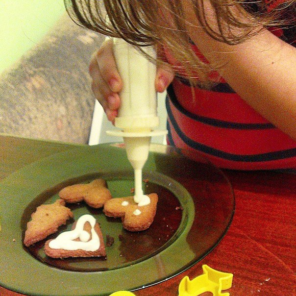 печеньки и домик украшали глазурью (один-два белка взбить, постепенно добавляя сахар или сахарную пудру 0,5 стакана примерно)
