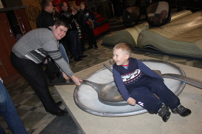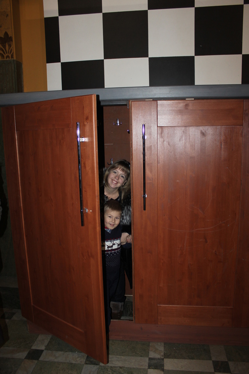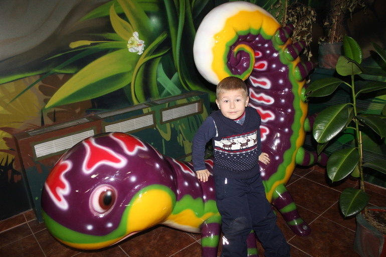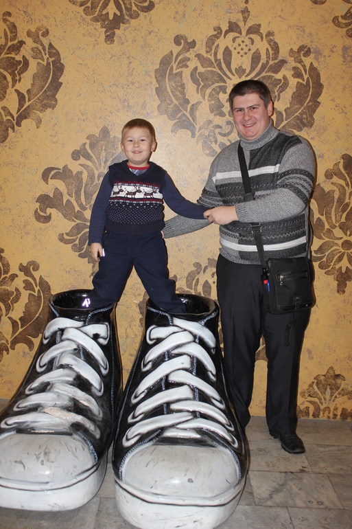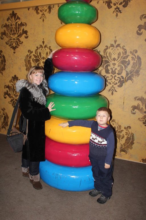 Сначала мы посетили комнату великана. Очень необычно... Детишкам там нравится и наш Славик не исключение... Но народу там много, да там везде много народу. Я боялась Славика потерять. И еще одно... Там нет гардероба. Это тоже неудобно. Вещи просто складываются и вешаются на вешалки и полки..Честно скажу, так как нашему народу я не доверяю, то шубу свою оставлять боялась... Носила ее в руках или на себе... Мальчишки мои вещи оставили...