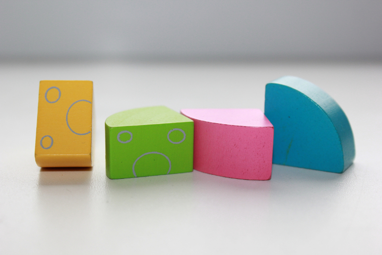 В квадратной большой коробке из плотного картона мы найдем желтое игровое поле, выполненное в форме круга сыра, расчерченное клетками 7 на 7,...