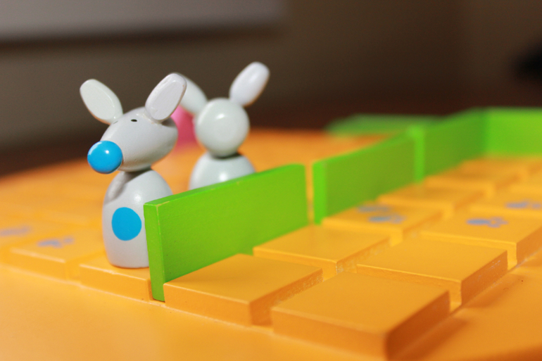 Чтобы было нагляднее, давайте сыграем вместе. Итак, наши противники Синий Мыш и Розовая Мышка становятся на противоположные края доски. Старт всегда с четвертой клетки первого ряда. Ходить можно влево-вправо-вперед-назад. По диагонали нельзя. В свой ход вы можете продвинуть фигурку на одну клетку или поставить одно заграждение.