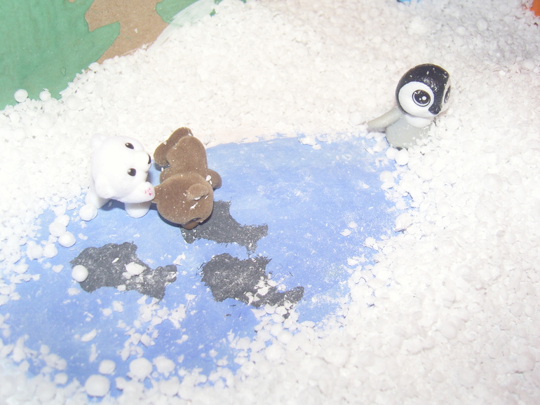 Затем мы решили что белому мишке нужна вода (иначе где он сможет ловить рыбку) и мы нарисовали озеро с рыбками в нем!