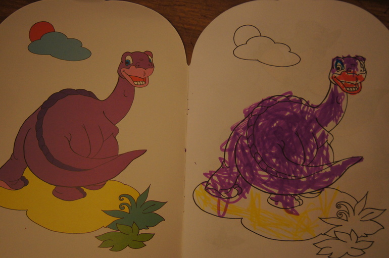 Первая это раскраска по мотивам мультика "земля до начала времен". Там Петри, Сара, Литл Фут и т.д.