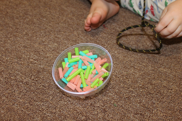 У запасливой хозяйки каких только вещиц в доме не найдется. С лето осталась огромная пачка соломинок, обрезали их на разные по размеру частички, вытащили из папиных ботинок шнурки и делали змеек.