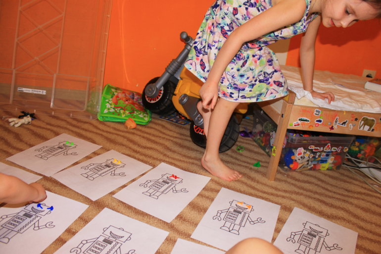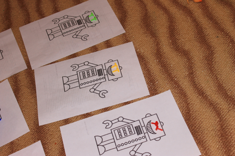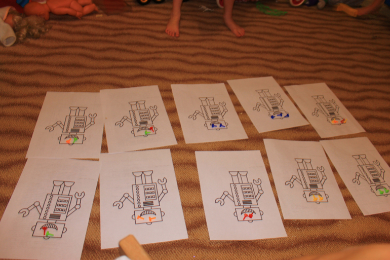 Игра усложнялась и менялась по мере потребностей: сделать как можно больше одинаковых роботов, сделать роботов с разными глазами (светлым и темным) и посчитать сколько разных получится, запомнить всех роботов,закрыть глаза (я меняю пару деталей), а открыв определить что изменилось и пр