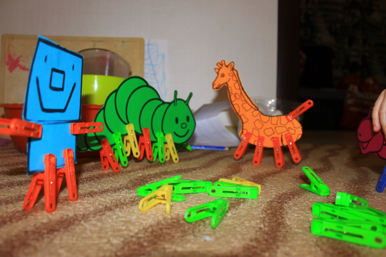 Ох и недооцениваем мы всех свойств этих простых вещей. Ну начнем с простого предложения детям нацеплять прищепки на листочки бумаги, можно попробовать скреплять прищепки между собой, можно делать «ножки,ручки,хвостики» каким-нибудь существам.