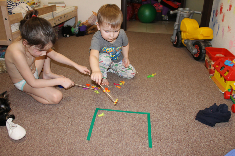 В эту игру легко включаются и изучение/повторение цветов,размеров,свойств предметов. Большие рыбки складывались в большое ведерко, маленькие в маленькое. Или например желтых рыб можно было ловить лишь желтыми "удочками" и пр.