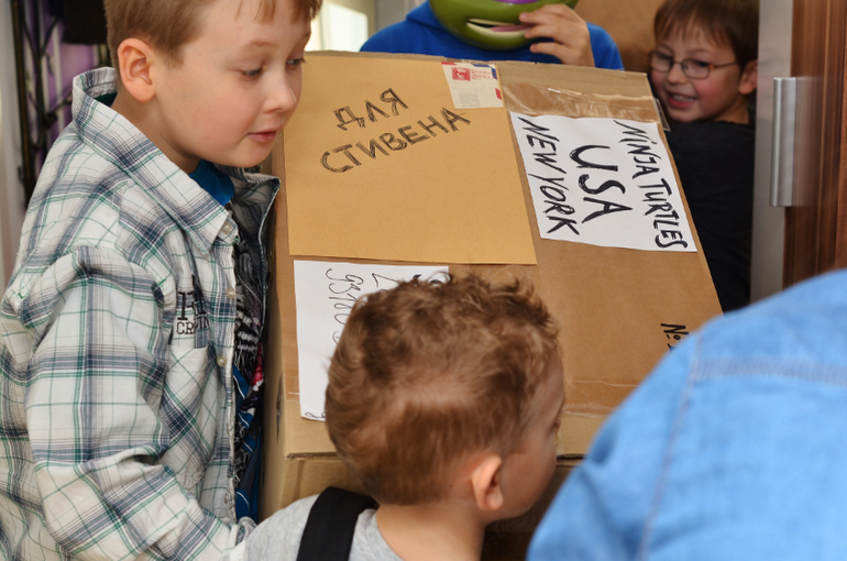 И, когда уже все собрались, вдруг, раздается еще один звонок. Спросив Стивена, ожидает ли он еще кого-то, я пошла вместе с ним открывать дверь. Какого же было наше удивление, когда вместо гостя мы увидели перед дверью посылку, адресованную Стивену, да еще не откуда-нибудь, а из Америки и от самих черепашек ниндзя. Мальчишки, умевшие читать, были просто в шоке))) С возгласами «ЮэСА?!!», «Нью Йорк?!!», они схватили коробку)))