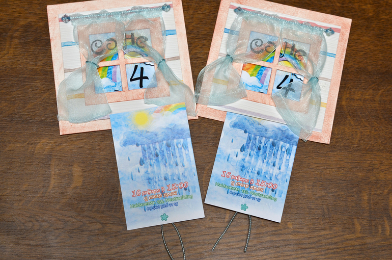 1. Приглашения . Девочки их сделали очень оригинально. Окошко с дождиком, а радуга то где? ..дождик убираешь и в окошке появляется радуга, а на вкладыше написано само приглашение на день рождение. Очень классно!!