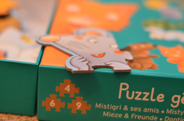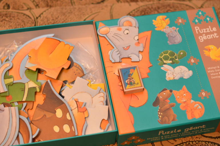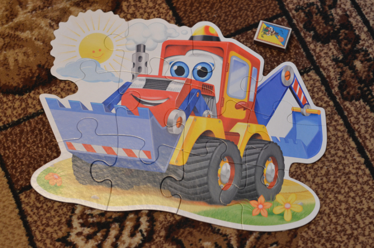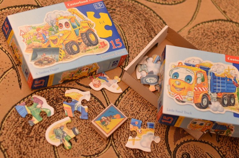 Котенок Мистигри - детальки большие ,качество не убиваемое, даже запах дорогой печати. Коробка - отдельная тема, выдержала частые прыжки и использование в качестве вертилки-тренажора для талии. А вот пазлы собирались раза 3 от силы. Нет машинок - нет интереса:(