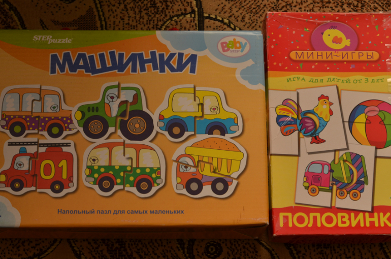 Где-то в 1,6 Ундю перестали интересовать рамки-вкладыши, он их разбирал-собирал за пару минут, и я предложила ему пазлы из 2 частей Половинки. Выбор оказался неудачным, они очень тонкие, а некоторые вообще неодинаковые, собирать их было трудно и Ундю их почти не доставал, разве поразбрасывать. Тогда я купила ему половинки от Степ-пазла с букашками (аналогичные Машинкам) и дело пошло.