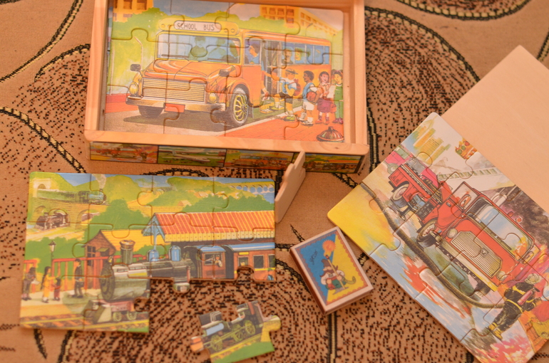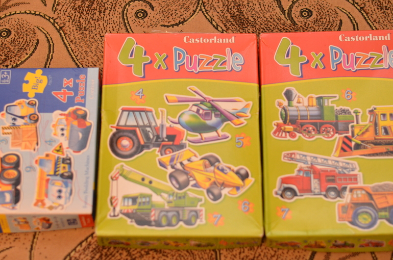 Андрюха возлюбил их со страшной силой. Сам еще собирать не умел, но собирать должны были все и постоянно, снова и снова... Потом я купила средний. Эти 2 коробки всегда были в ходу, сначала он научился собирать из 4 частей трактор и самосвал, раз я засекла, как сам сложил паровоз из 6 (это было примерно в 1,7, в период обожания железной дороги). Он мог ночью вскочить, притащить мне эти пазлы и не успокоиться, пока все не собрать, не рассказать, где дяди, что они вертят руль, где идет "дим", потом мама должна была на ладошке перенести наши машинки на кровать спать, и, не дай Боже, что-то развалится по дороге, трагедия была вселенского масштаба.