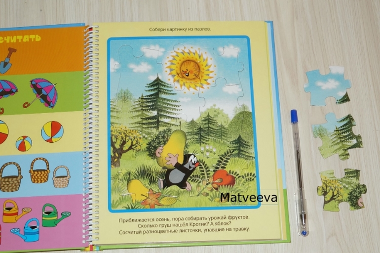 Первый разворот счет и пазлы)) пазлы хорошие, качественные, состоят из 12 кусочков, разрезаны интересно, довольно крупные) на подложке есть дублирующая картинка)) изображение не сложное, дочка освоила довольно легко))
