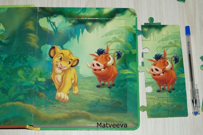 Пазлы здесь уже посложнее: картинки состоят из 6 частей и картинки довольно трудные с большим количеством деталей) но на подложке есть дублирующая картинка) сначала можно собирать пазлы в книге, а потом просто на столе) качество очень хорошее, картон плотный ламинированный, собранное изображение не рассыпается, детальки крупные)