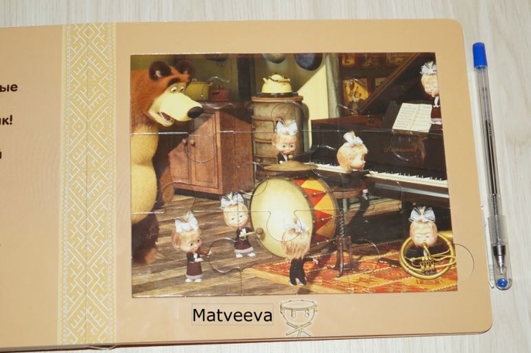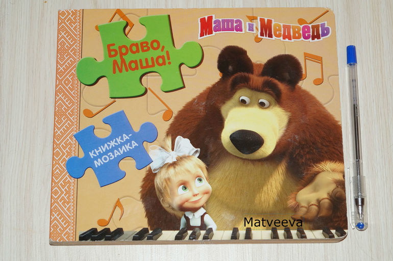 Следующей страстью дочки стал мультфильм "Маша и Медведь", поэтому я заказала ей книгу-пазл с любимыми героями))