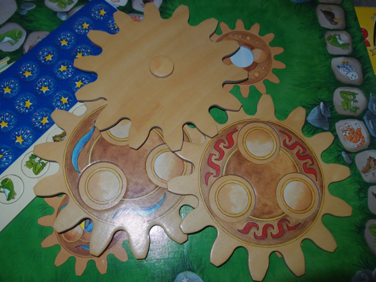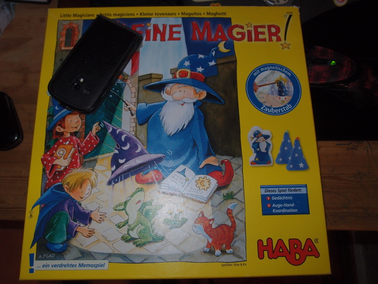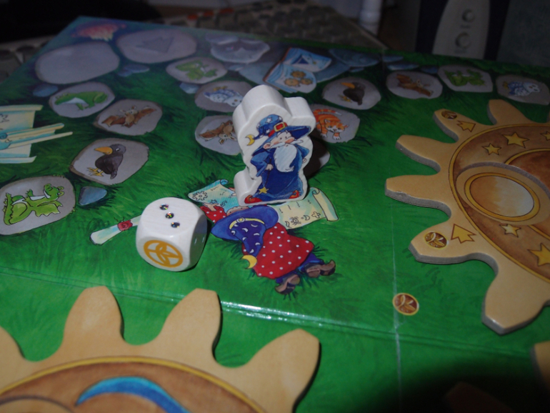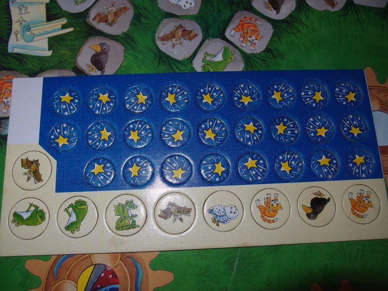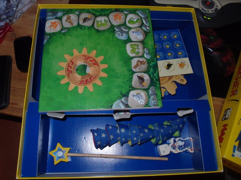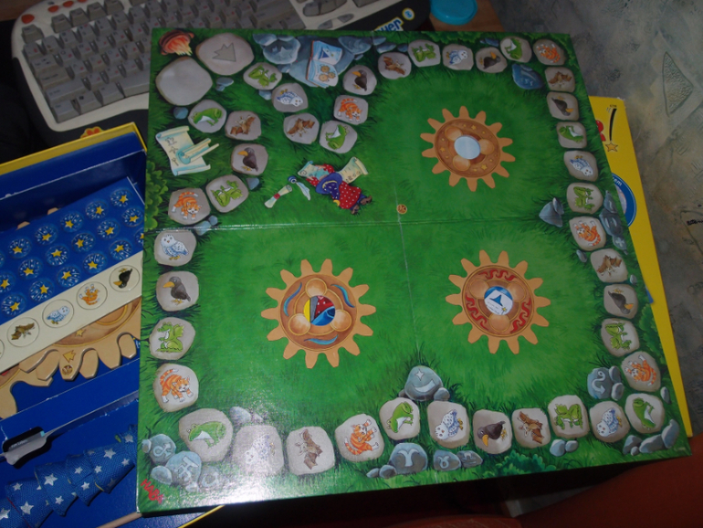 не буду рассказывать условия, их можно найти в интернете, но конфликты у детей прекратились, главное не быть первым или лучшим, главное верно наколдовать зверушку и довести волшебника до финиша - всем вместе). кстати, все детали большие и очень яркие, кубик с блестяшими точками, а палочка с магнитом, копачки примагничиваются к ней и поднимаются))). а теперь фото![]()