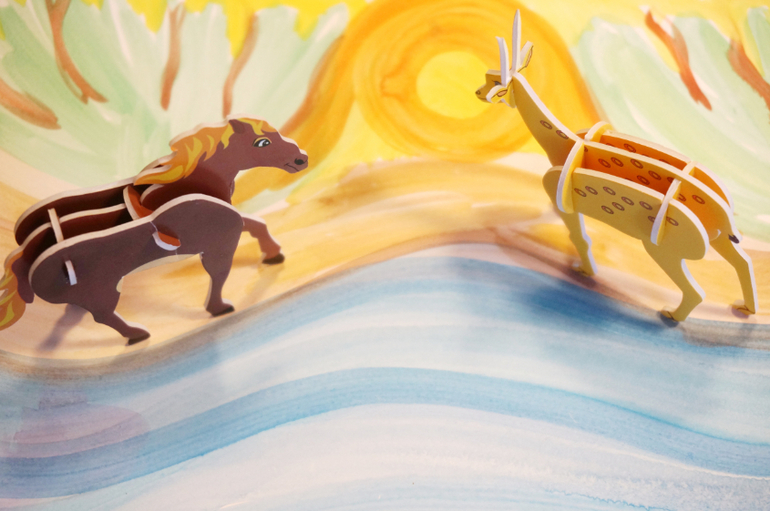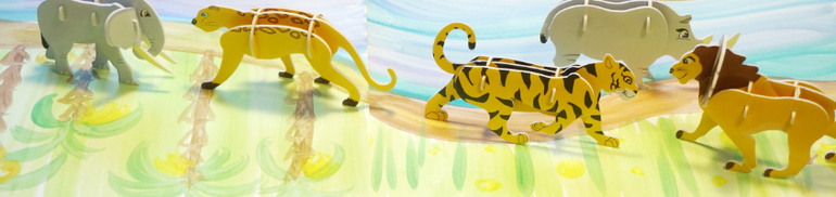 Развивающие игрушки (пазлы, вкладыши, конструкторы, мозаики)Недавно нам подарили 3Д пазл про животных, который как-то долго валялся без дела. Я решила собрать 1 животное, и вовлеклась в процесс вместе с Машей. Приятно, что довольно недорогое изделие (около 250руб.) отлично вынималось, складывалось, получалось! Фигурки довольно реалистичные и устойчивые, но к ним быстро пропадает интерес после сборки без определенного контекста. Мы взяли акварель и стали рисовать им среду обитания, реку, пальмы с кокосами и бананами, дорогу, оранжевый закат. Сразу появилось настроение, сюжет, ролевая игра, новые слова и понятия! Потом мы принесли друзей Лего и сравнивали, кто кому родственник! Фигурки до сих пор живы и стоят в сторонке, Маша к ним иногда забегает! А у вас какие интересные находки на почве пазлов?