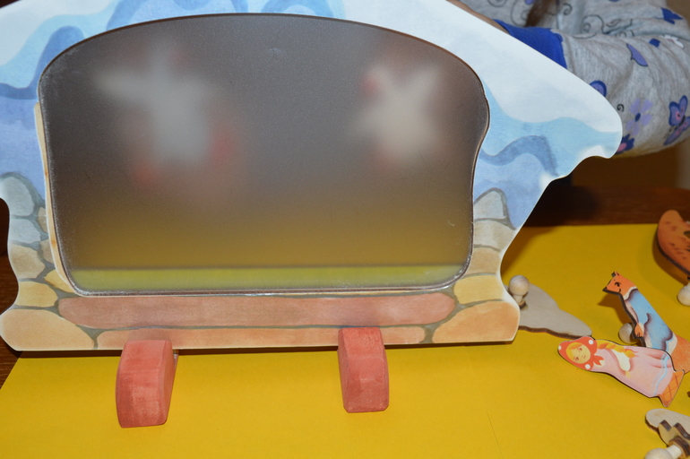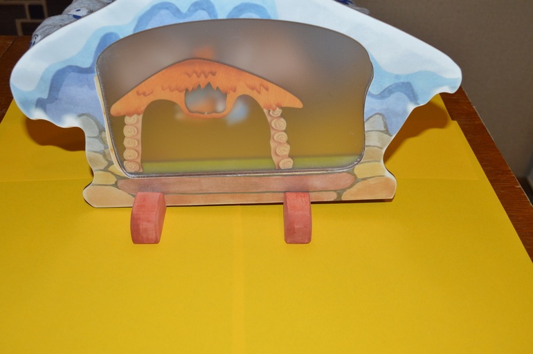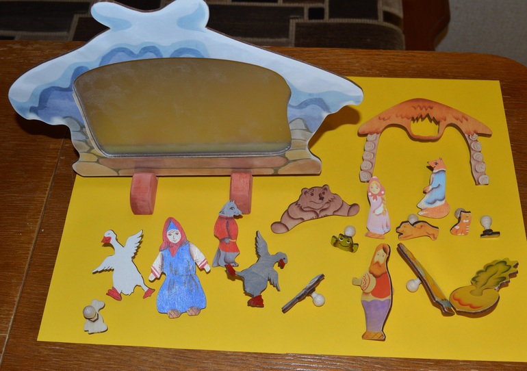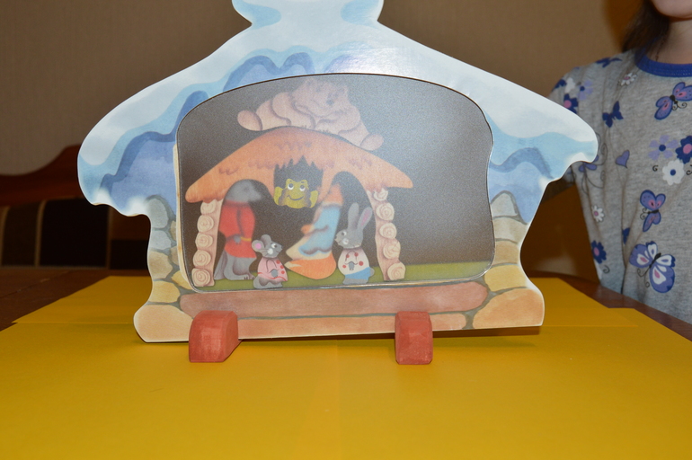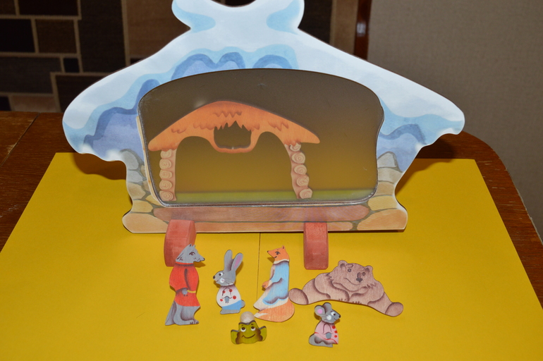 В наши дни лед заменили на прозрачный матовый тонкий пластик, обладающий таким же туманным эффектом. Сзади экрана есть полочка для установки персонажей.Весь театр оформлен в виде деревянной заснеженной избушки, а фигурки снабжены держалочками ( производитель "Сказки дерева").