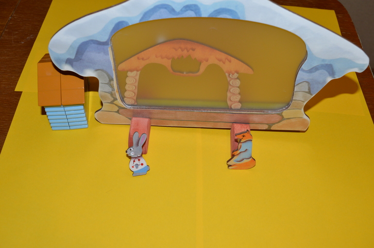 А потом Анютка решила не останавливаться и придумала, что надо бы и другие сказки разыграть. И принесла "ледяную" избушку для сказки "Лиса и заяц". правда она у дочки получилась немного переделанной: место петуха выступал гусь и расправа у него была более щадящая, всего лишь защипать за пятки. Но лиса испугалась и убежала.