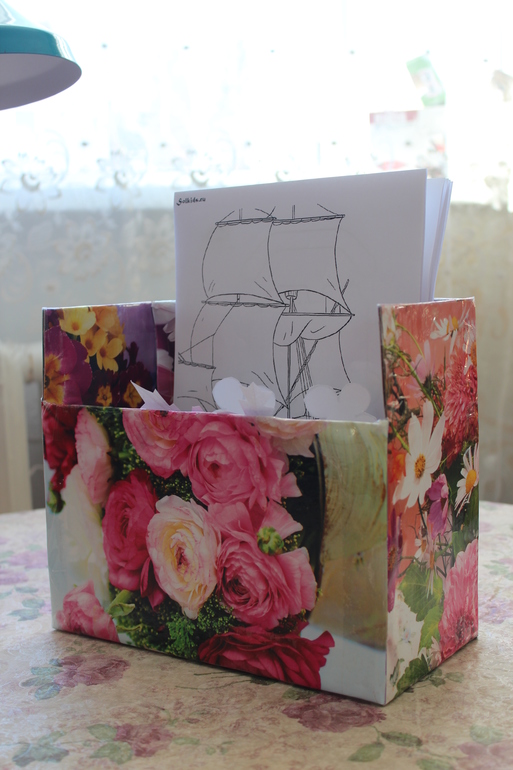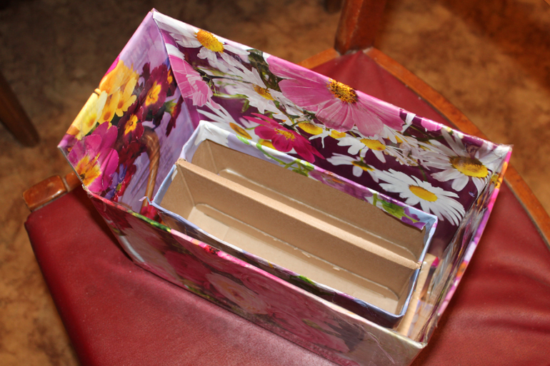 Удачно нашла подходящие по размеру коробки. Внутренние перегородки нужны, иначе листы разъезжаются и наклоняются. Внутренняя приклеена 2-сторонний скотч. Перфекционизм подкрался незаметно и зачем-то я обклеила внутренюю коробку :)))