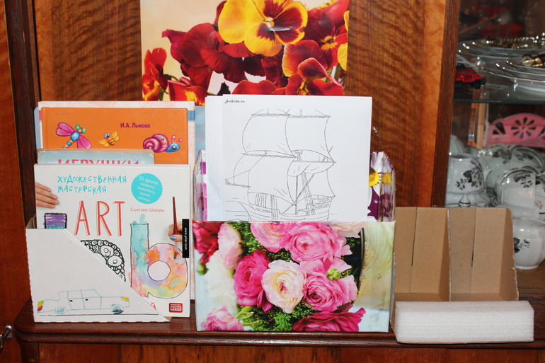 Общий вид упорядоченных материалов для творчества. Подставка для книг ещё не продумана, декор от папы :)