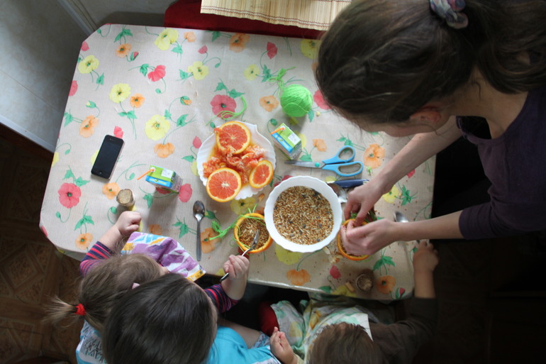 Настряпавшись, приступили к изготовлению кормушек, решили, что и нам нужно птичек призвать, чтоб они Весну привели. Срезали треть апельсина, очистили внутри, продели верёвочки и заполнили кормом для диких птиц.