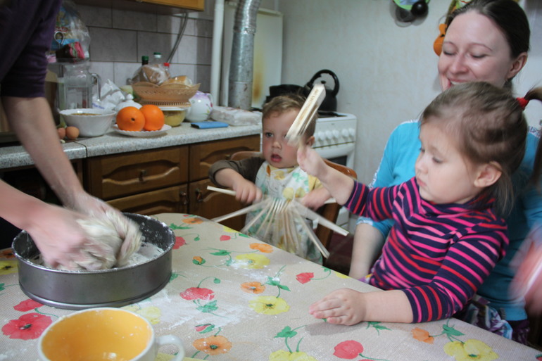 Блины печём почти каждый день, всю неделю, но вот сам праздник решено было устроить в четверг. Пришли наши друзья: закадычная подруга Варя со своей мамой. Звала ещё ребят с мамами из двора, но никто не дошёл больше. Театр. На этот раз «съедобный». Детям надели фартуки и усадили перед кухонным столом, где их уже ожидали «артисты»: чашка с мукой, яйца, молочник с молоком, ложка и форма для выпечки.