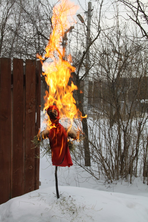 Потом сожгли Чучело, зрелищно, конечно, и завораживающе. Для чучела купила сена самого дешёвого в зоомагазине, обрезала белый мужнин носок - надела на голову, и разрезала старую красную кофточку.