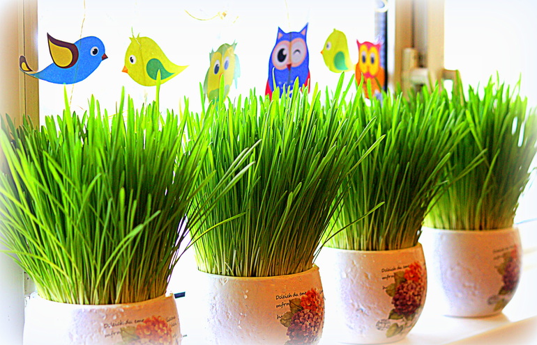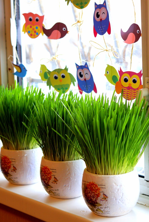 Очень уж классно такие горшочки с травкой украшают окно. А уж если прибавить к этому разноцветную подвеску из совушек, так и подавно.