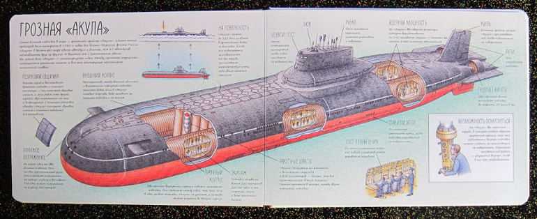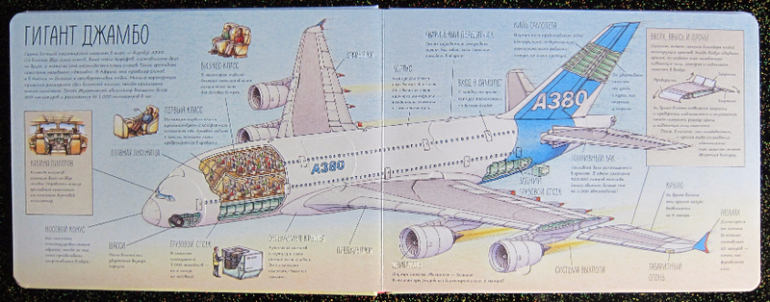 Что же внутри книги? Восемь разворотов, на каждом изображен один гигант и много полезной и интересной информации. Книга с окошками, под которыми спрятались "внутренности" машин.