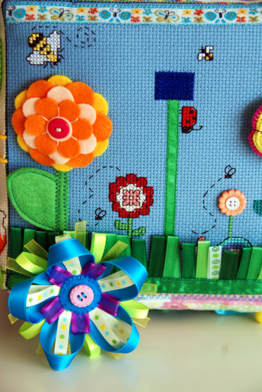 1) Цветочки из фетра, лент и связанный крючком. Тот, что в серединке, на липучке, так что, его можно "сорвать") Пчёлки, божьи коровки и мушки вышиты крестиком.