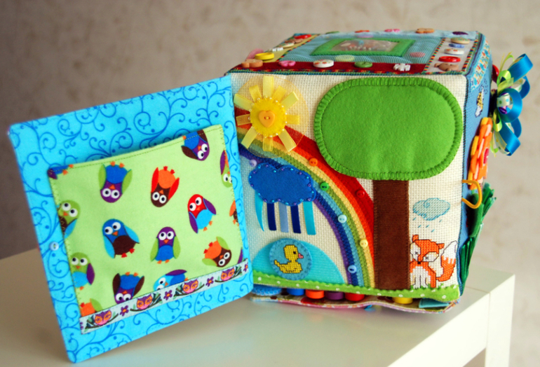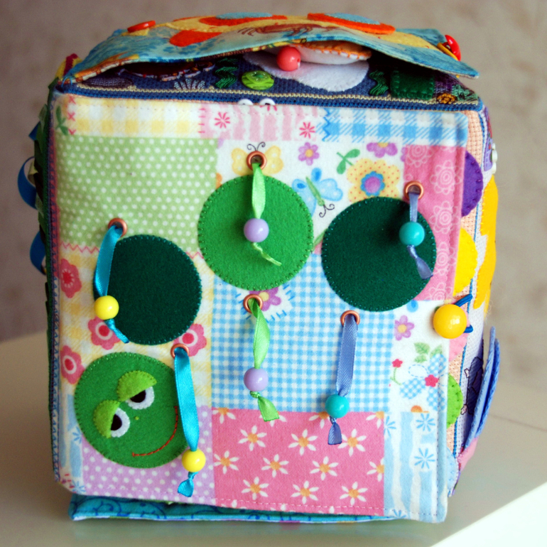 Такой кубик это не только игруха, предоставляющая разнообразные тактильные ощущения и развивающая мелкую моторику. С ним можно учить цвета, учиться считать, находить общее и различное, придумывать истории, учить стихи и многое многое другое) Не забываем, что с такой игрушкой ребёнок должен играть только под присмотром взрослого. А ещё лучше, играть вместе)